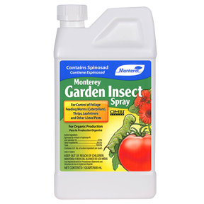 Monterey Insect Spray with Spinosad is a new chemistry for insect control. This spray contains spinosad, produced by fermentation, and be used on vegetable, fruit crops, ornamentals, and turf. For control of foliage feeding worms (caterpillars), thrips, fire ants and other pests in lawns, outdoor ornamentals, vegetables, apples, citrus and stone fruit.
